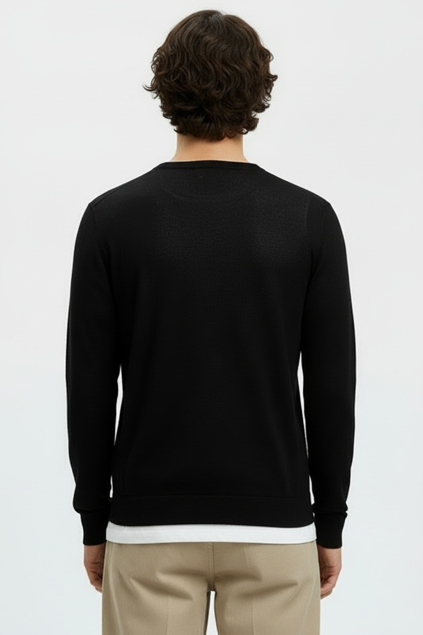 This black crew neck sweater offers a timeless and comfortable choice for everyday wear. Designed with a regular fit, it features long sleeves and ribbed cuffs that add subtle detail while ensuring a cozy feel. The blend of cotton and organic cotton gives it a soft texture and reflects a commitment to sustainability through natural materials.