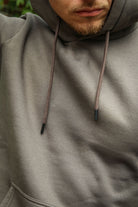 - Solid color sweatshirt with a hood.