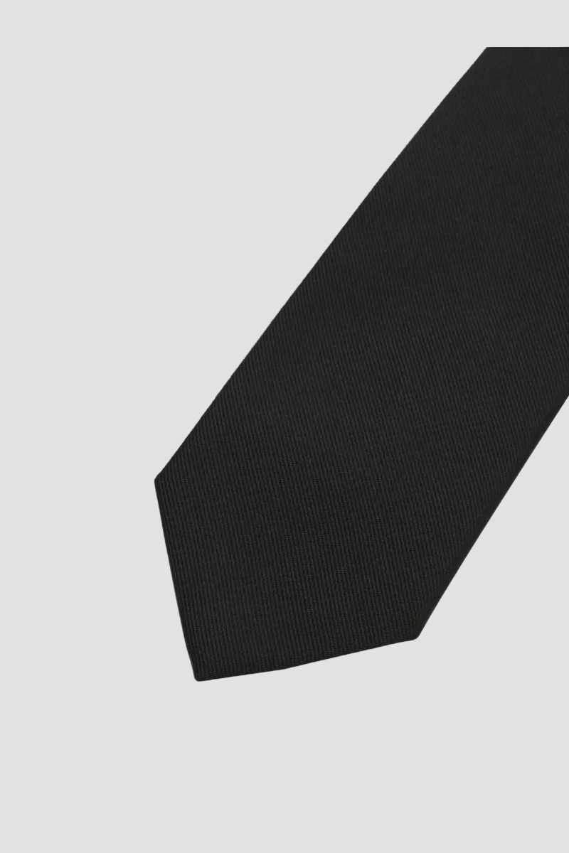 This structured tie is crafted from durable woven fabric, offering a strong texture that maintains its shape without stretching. Made with sustainability in mind, it incorporates at least 50% recycled polyester, adding an eco-friendly touch to formal attire. Its classic black color makes it a versatile accessory ideal for elevating any outfit when the dress code calls for a polished and traditional look.