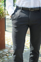 Comfort Pants in Stripe Black color are designed with an elegant tapered fit, giving the pants a modern and stylish silhouette. The pants are tight around the ankles and looser around the hips, providing a comfortable and flexible fit. -