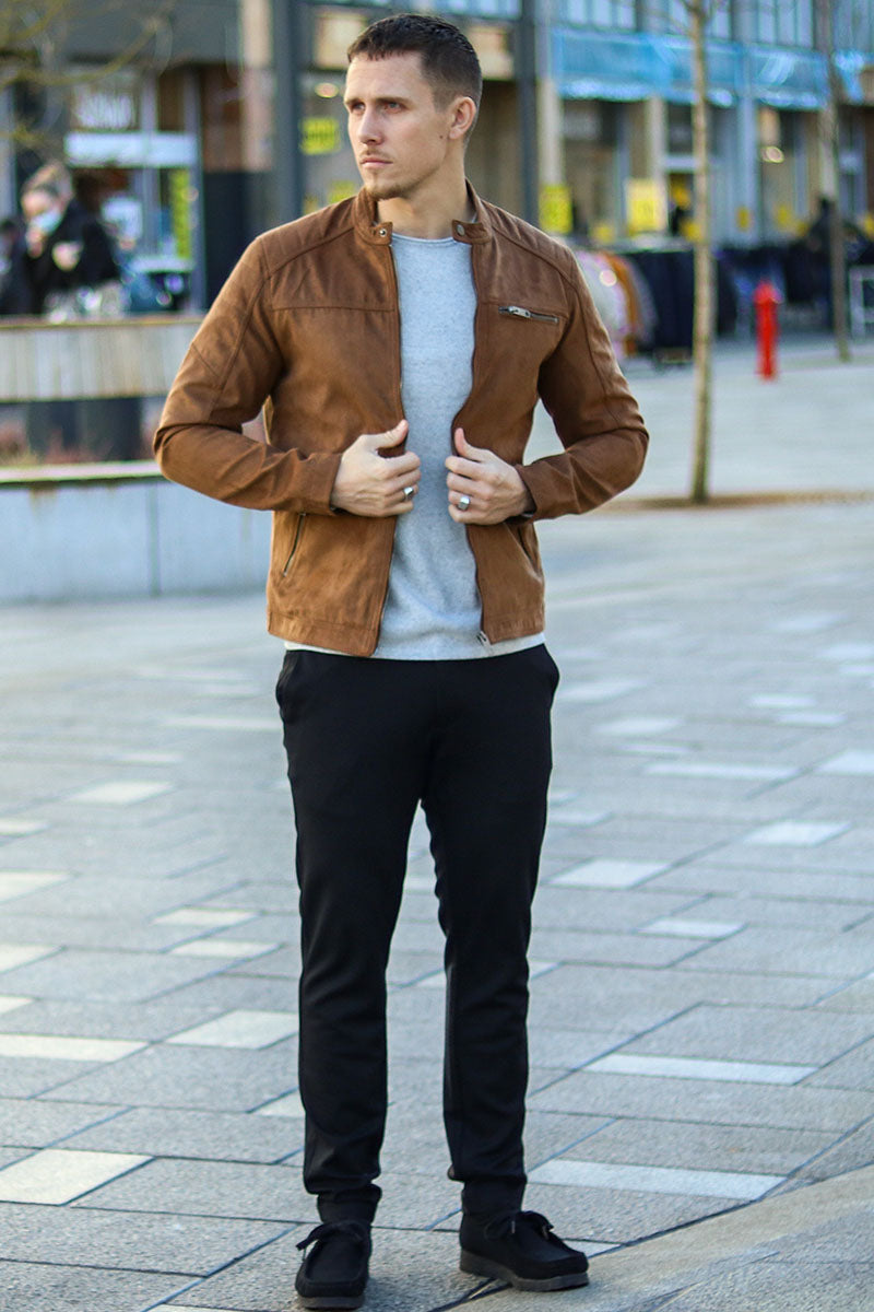 This jacket is designed with a biker collar and long sleeves, perfect for casual everyday wear. Made from 100% polyester coated with polyurethane, it offers the look and durability of synthetic suede while being easy to maintain. The jacket features quilted detailing, adding some texture and style to a classic outerwear piece. It closes with a zip fastening and includes side and chest pockets, both equipped with zippers for secure storage.