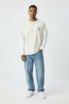 This relaxed fit tee features a classic crew neck and short sleeves, crafted from lightweight and stretchy jersey fabric that ensures comfort throughout the day. Its off-white hue offers versatile styling options, making it easy to pair with any wardrobe staple.