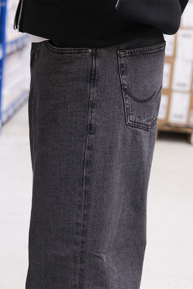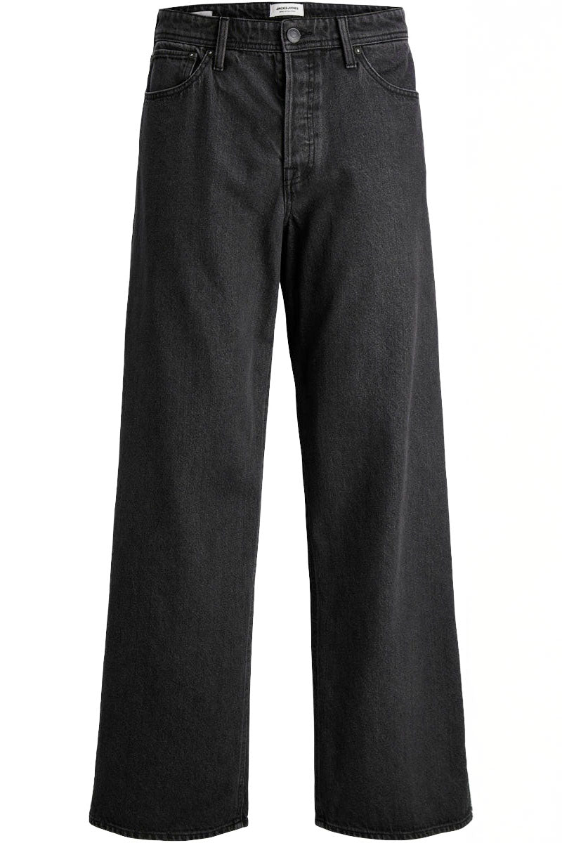 These wide fit jeans in black denim offer a relaxed, baggy fit with a high rise waist for comfortable, casual everyday wear. They feature a zip fly fastening and practical pockets, including back pockets, a coin pocket, and front pockets. The stonewash finish gives them a faded, worn look that complements their laid-back style. Made primarily from cotton, these jeans balance durability with breathability for all-day comfort.