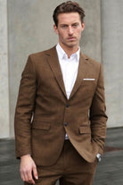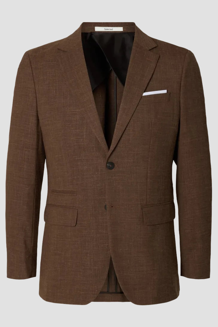 This slim-fit blazer features expert tailoring that reflects Nordic heritage through elegant and modern design. Crafted from a blend of polyester, wool, linen, and elastane, it combines comfort with refined style. The blazer is detailed with a notch lapel, button fastening, and buttoned cuffs, providing a classic yet contemporary look. Practical elements include a chest pocket with a pull-up hankie and front pockets, enhancing both function and flair.