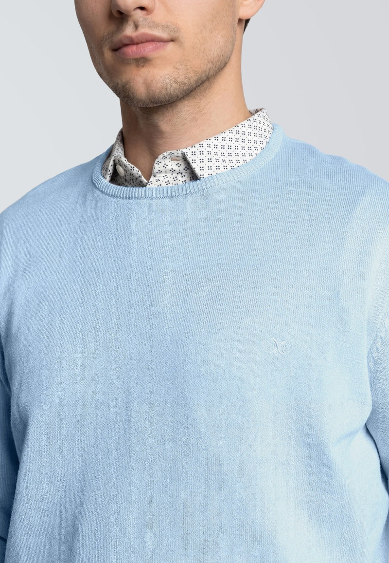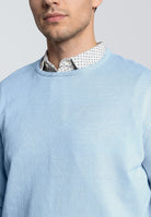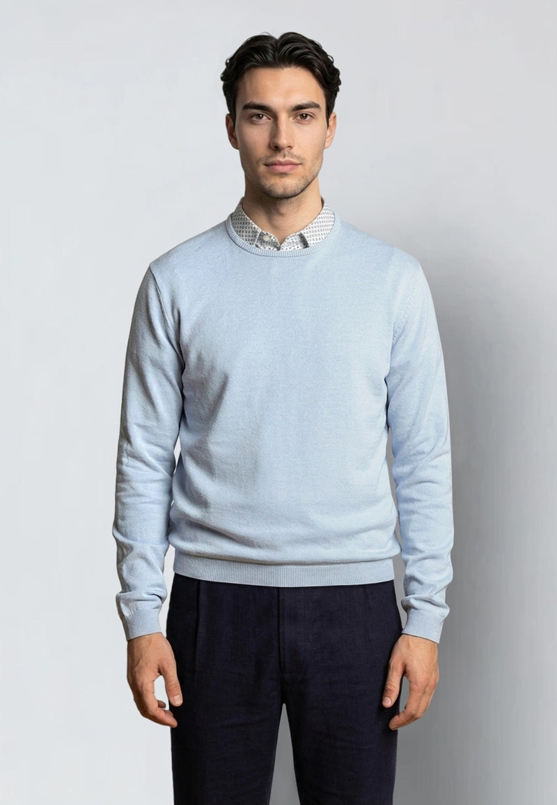 This lightweight crew neck knit is crafted from 100% cotton, offering breathability and comfort ideal for the spring and summer seasons. Its soft light blue melange color provides a versatile and relaxed look that pairs well with various casual outfits. The knitted construction ensures a cozy yet breathable feel, making it a go-to piece for adult men looking for simple style with quality materials.