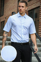The Comfort Shirt in the color Cashmere Blue Stripe is a sophisticated and stylish addition to any wardrobe. The classic design features short sleeves and a stretchy, comfortable fit, making it perfect for summer wear. The shirt also has a traditional collar, adding a touch of class to any outfit. -