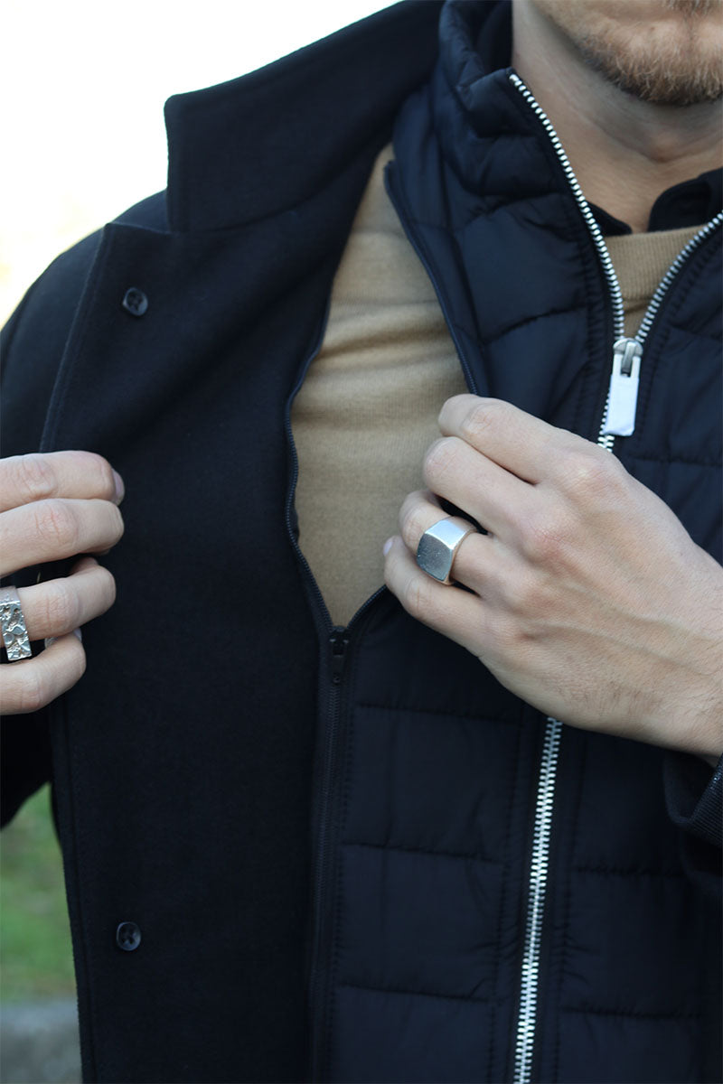- Black wool jacket with vertical side pockets.
