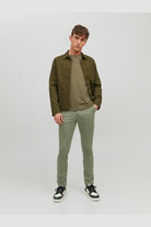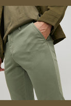 These slim-fit chinos offer a modern, low-rise silhouette crafted from a durable woven fabric that provides strength without stretch. Designed as a smart-casual alternative to jeans, they feature a zip fly fastening and practical front and back pockets, making them a versatile choice for everyday wear. The deep lichen green color adds a subtle, earthy tone perfect for seasonal wardrobes.