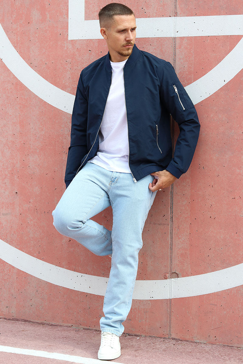 This bomber jacket offers a casual and comfortable option for everyday wear. Crafted from lightweight fabric, it feels thin and breathable while providing water-resistant functionality. The jacket features a baseball collar and long sleeves, combined with a practical zip fastening that runs along the front. It includes front pockets with zip closures and an additional sleeve pocket, making it both stylish and functional. Its short length adds to a sleek, modern silhouette.