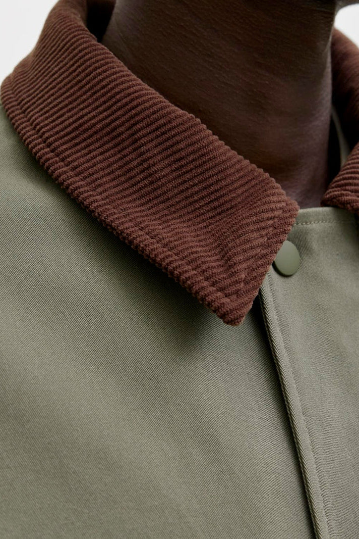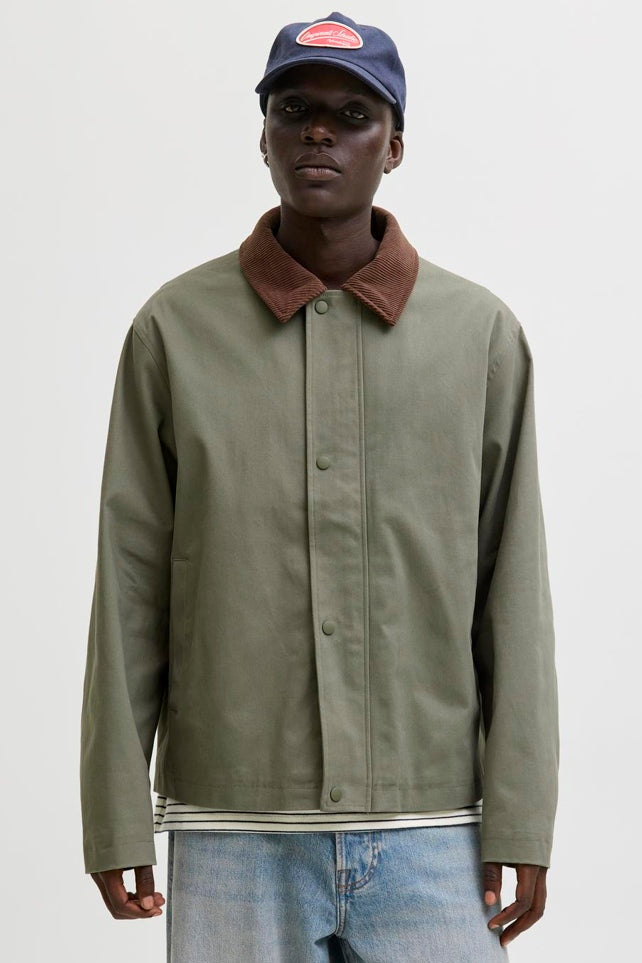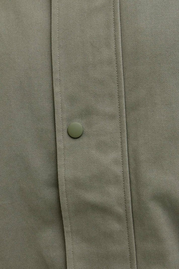 This worker jacket is designed with a rugged, timeless style that fits perfectly into a spring wardrobe. The jacket features a classic spread collar and long sleeves with inset armholes for a comfortable fit. The closure combines both buttons and a zipper, ensuring practical functionality and a clean, stylish look. The short length makes the jacket versatile and easy to pair with different outfits.