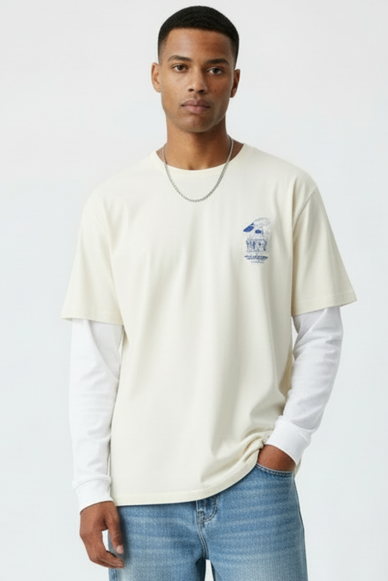 This relaxed fit tee features a classic crew neck and short sleeves, crafted from lightweight and stretchy jersey fabric that ensures comfort throughout the day. Its off-white hue offers versatile styling options, making it easy to pair with any wardrobe staple.