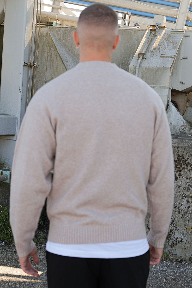 - Beige long‑sleeve knit sweater