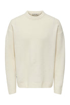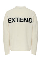 • The sweater has a round neck and large knitted text on the back. In addition, a small logo is sewn on the right side