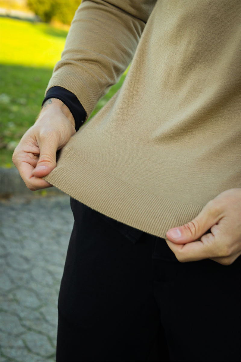 A knit pullover is highly versatile and can be used year-round. It's not too thick for a summer evening, and at the same time, it can easily serve as the top layer in winter when you need more warmth. A pullover can be super practical over a t-shirt, which, paired with a pair of jeans, gives it a very casual look. It can also be part of a more formal outfit with a shirt underneath—this is where the sweater truly shines with the shirt's collar and sleeves adding an edge to the outfit. Paired with a pair of chinos and loafers, the style becomes complete and can be worn for a business meeting or a family gathering. You can still maintain the casual look with a shirt underneath by, for example, adding a leather jacket and a pair of distressed jeans.