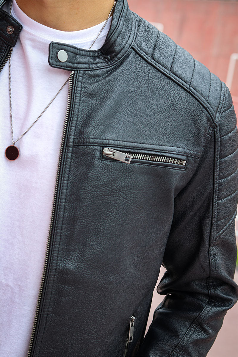 This jacket offers a sleek and casual style perfect for everyday wear. It features long sleeves and a biker collar, complemented by a zip fastening for easy use. The quilted detail adds subtle texture, while the black color with a polyurethane coating gives it a smooth finish that stands out in the autumn season.