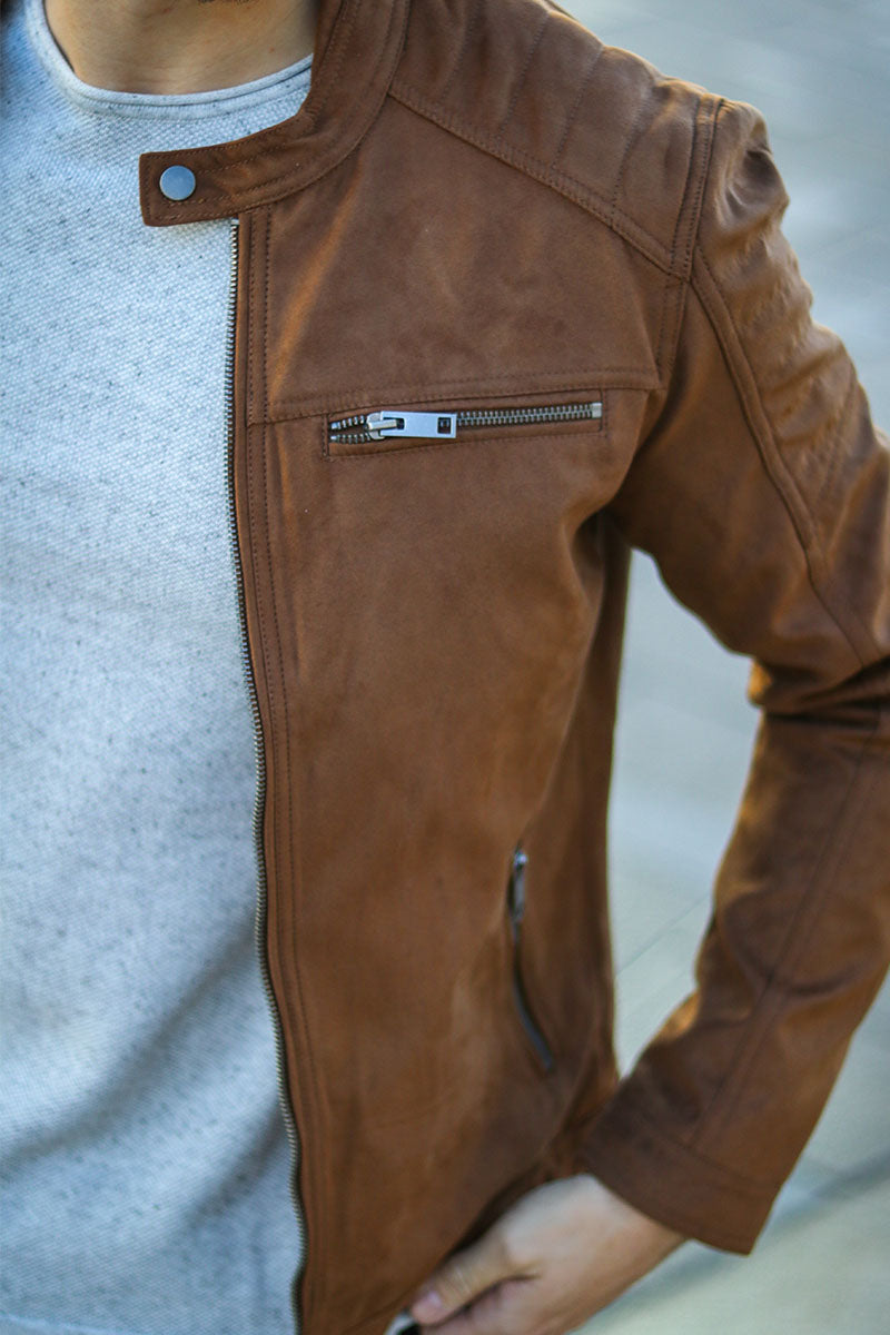 This jacket is designed with a biker collar and long sleeves, perfect for casual everyday wear. Made from 100% polyester coated with polyurethane, it offers the look and durability of synthetic suede while being easy to maintain. The jacket features quilted detailing, adding some texture and style to a classic outerwear piece. It closes with a zip fastening and includes side and chest pockets, both equipped with zippers for secure storage.