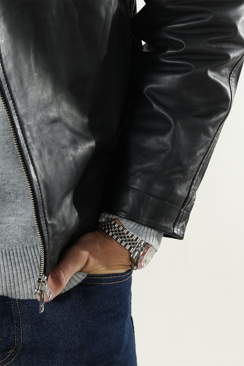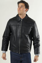 This leather blouson combines classic style with practical details, perfect for a timeless look suitable for any season. It features a spread collar and long sleeves, closing with a convenient 2-way zip fastening. The jacket includes both side and inside pockets, while the short length offers a sleek silhouette. A polyester lining enhances comfort without compromising on style.