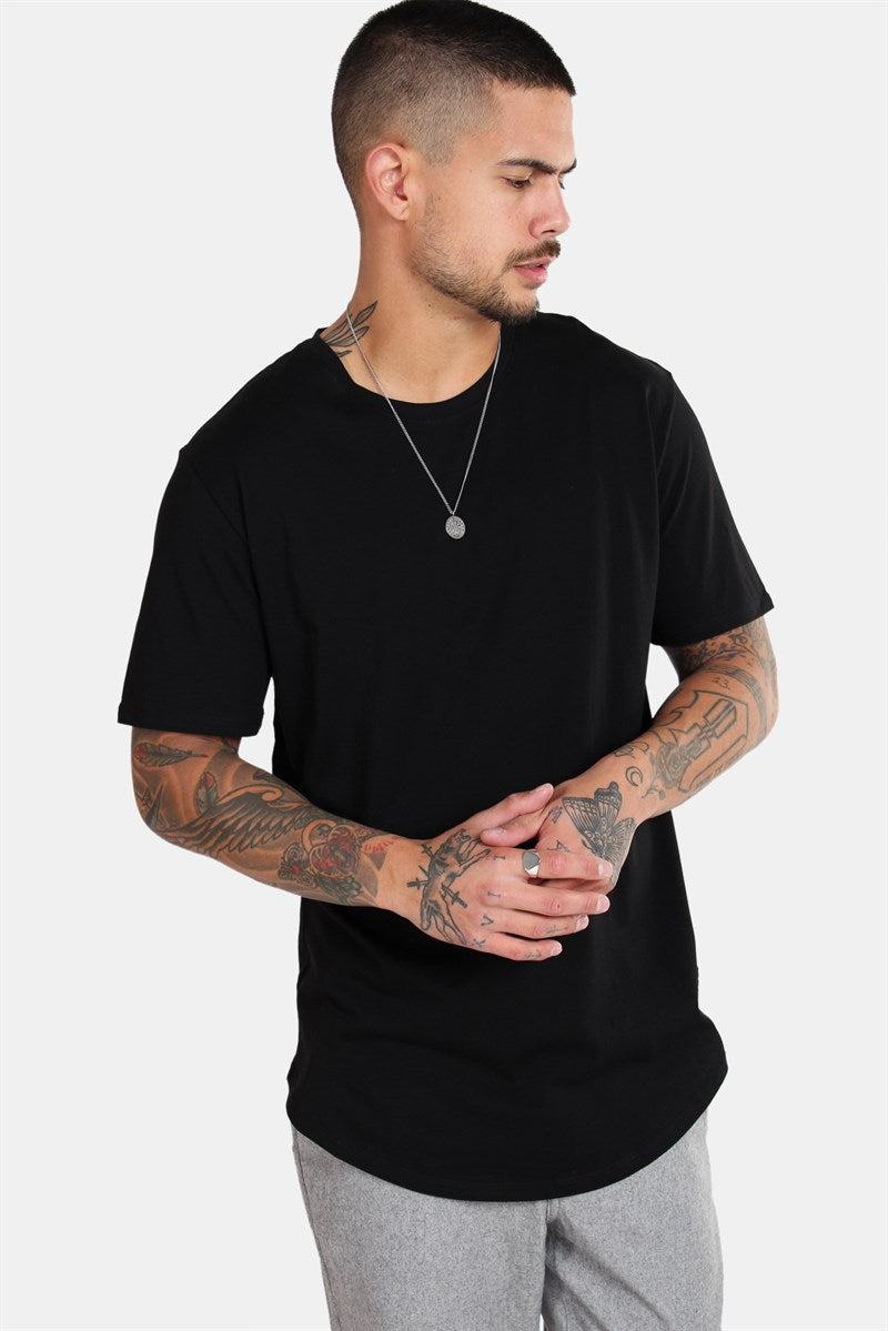 This longline fit tee features a round neck and short sleeves, crafted from soft and stretchy jersey fabric that ensures maximum comfort throughout the day. Designed with an extra-long length, it provides a modern silhouette that pairs well with both casual and smarter outfits. This 3-pack in classic black offers versatile basics that complete your wardrobe for everyday wear and special occasions alike.