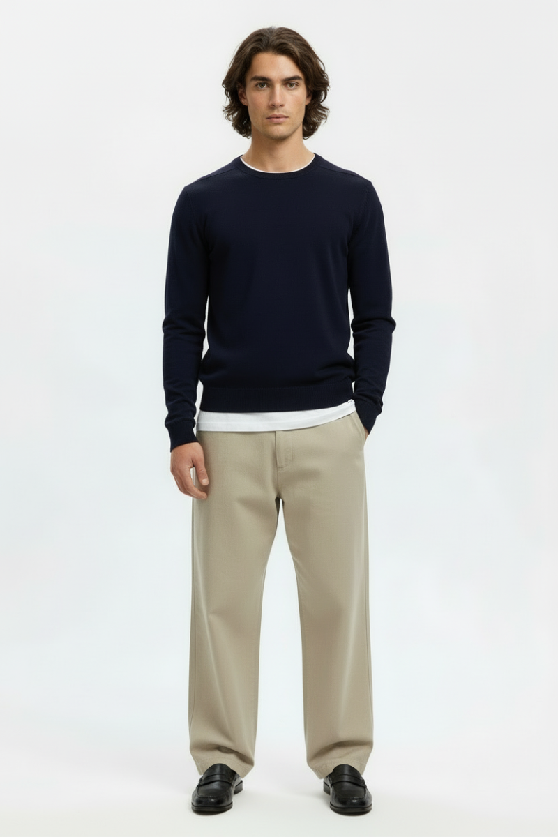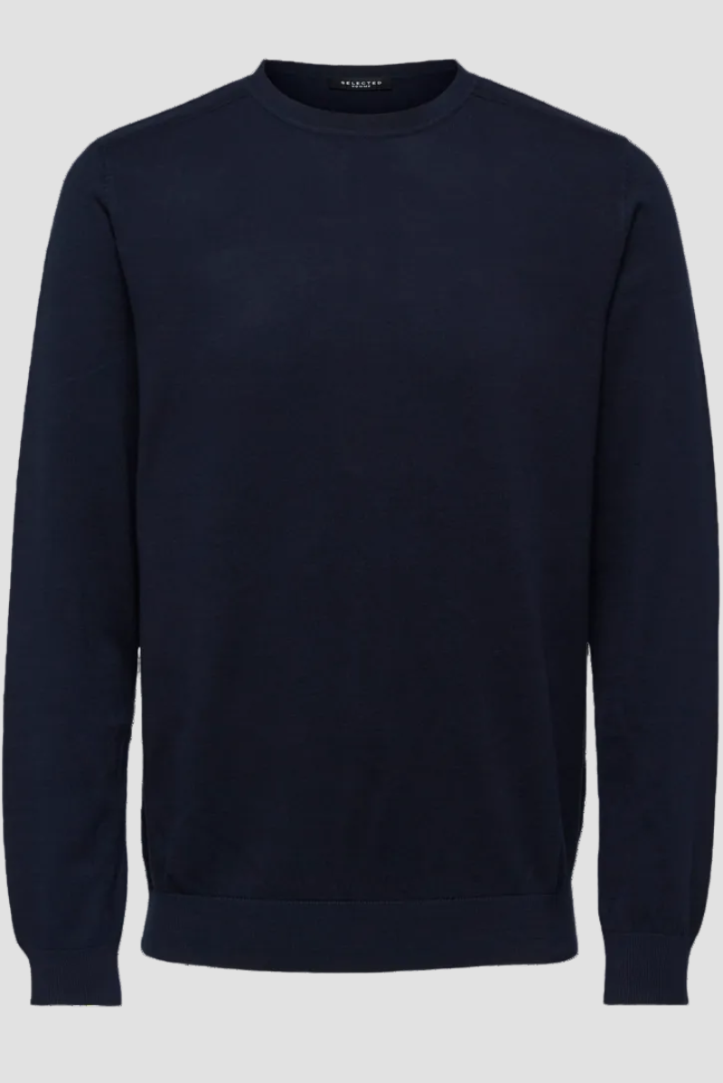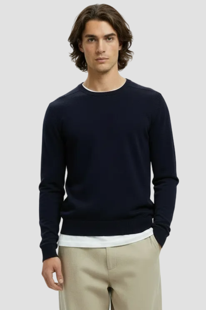 This regular fit pullover features a round neck and long sleeves with ribbed cuffs, making it a timeless and comfortable choice for your everyday wardrobe. Its dark navy melange color adds subtle detail to a classic knit style. Crafted from a blend of 50% cotton and 50% organic cotton, it offers both softness and sustainability.