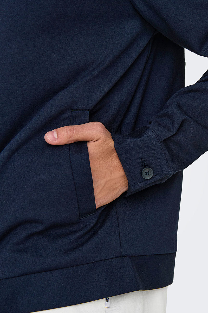- Dark blue bomber jacket with zipper closure.