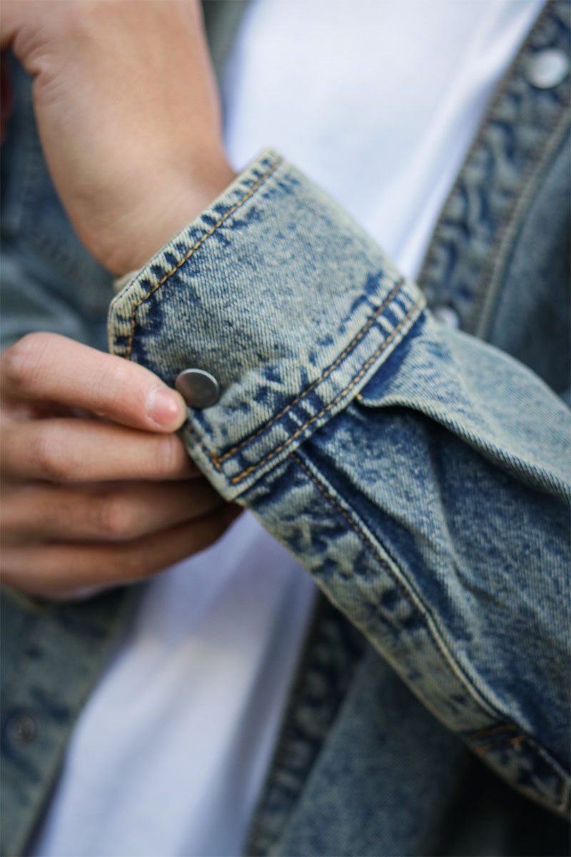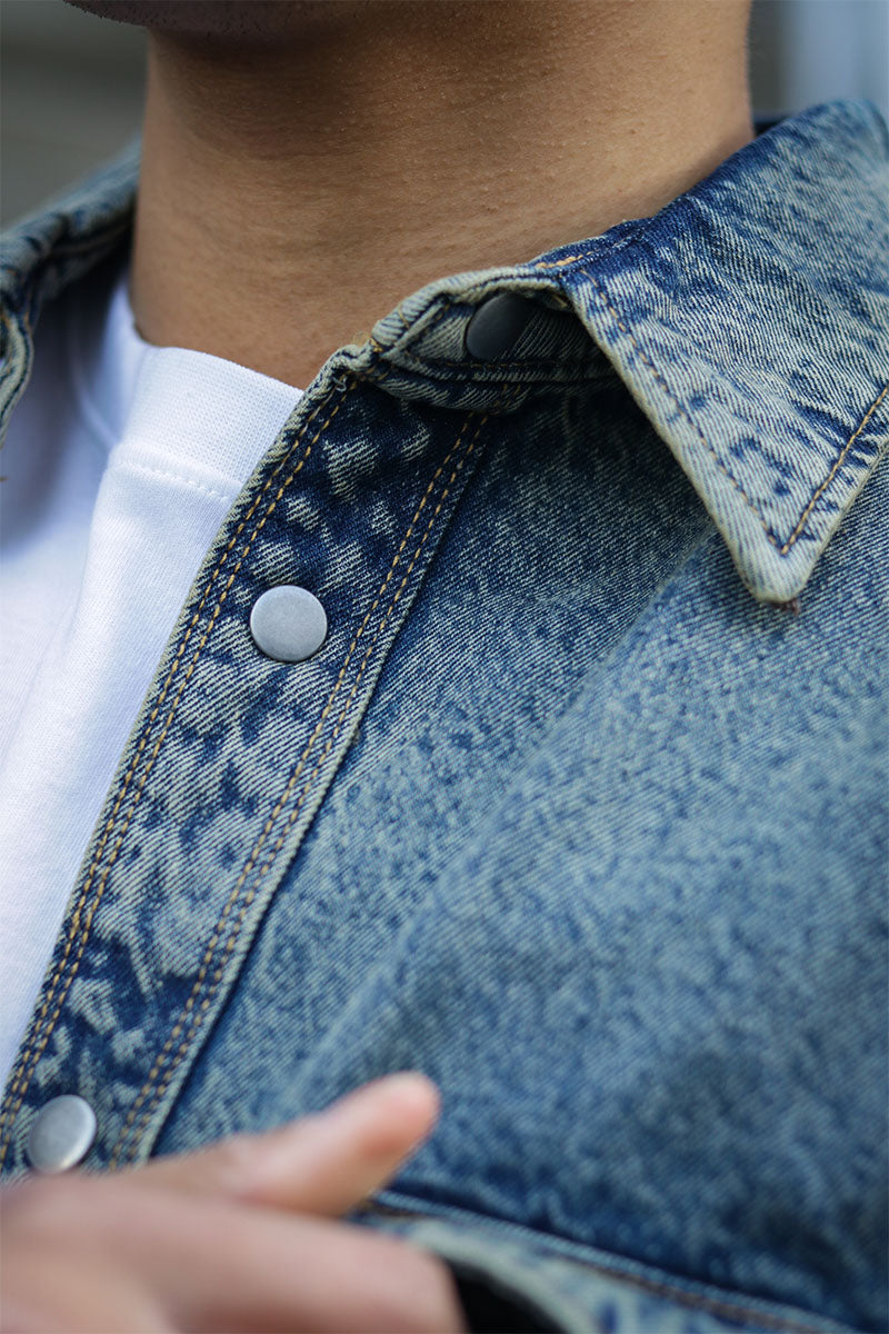 - Denim shirt with button closure.