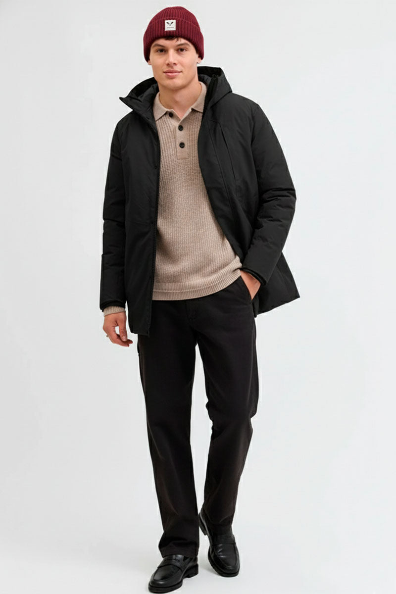 - Solid-colored parka jacket with hood