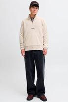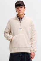 - The sweatshirt has a kangaroo pocket and a small print on the chest