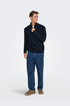 This regular fit knitted pullover features a crew neck and long sleeves, finished with a half zip fastening for easy wear. Its structure knit offers a stylish and clean appearance through a variety of patterns and textures, making it a comfortable and timeless choice for colder seasons or chilly evenings. Made with sustainability in mind, the main material includes at least 50% recycled polyester, blending responsible production with quality.