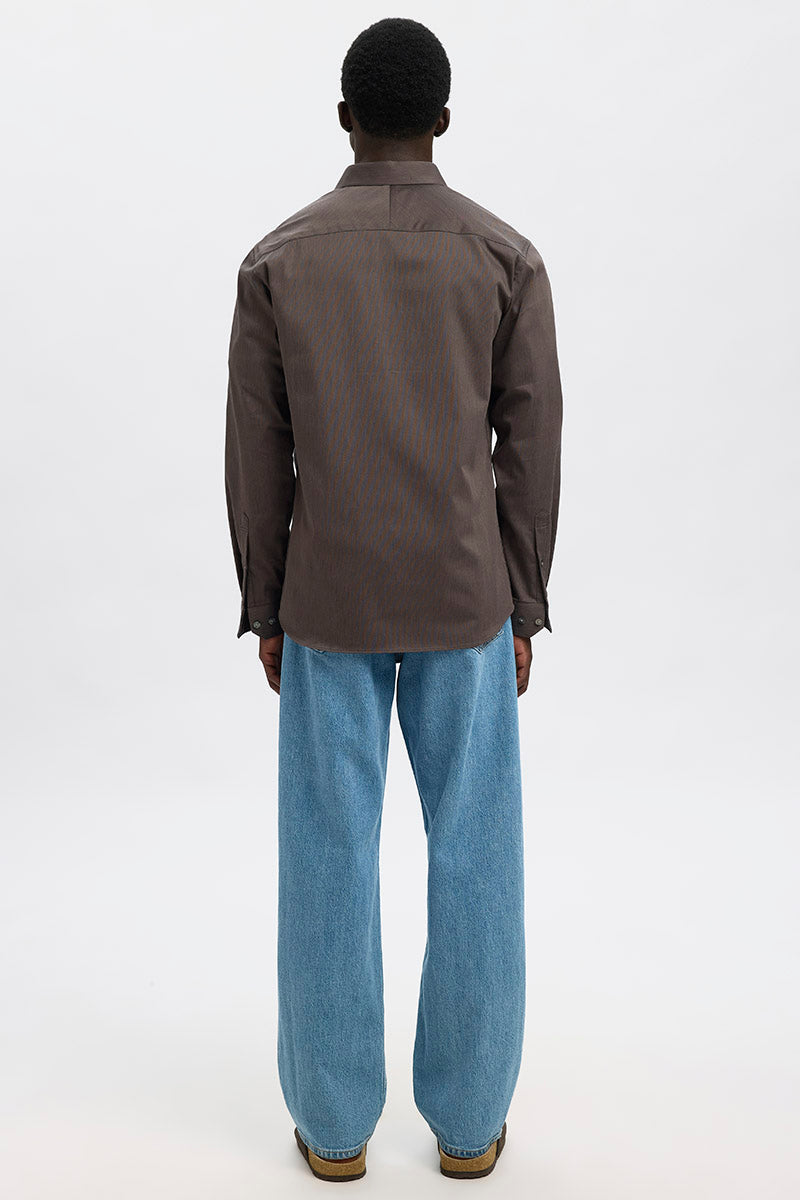 • Shirt with a regular collar, curved hem, and long sleeves with buttoned cuffs