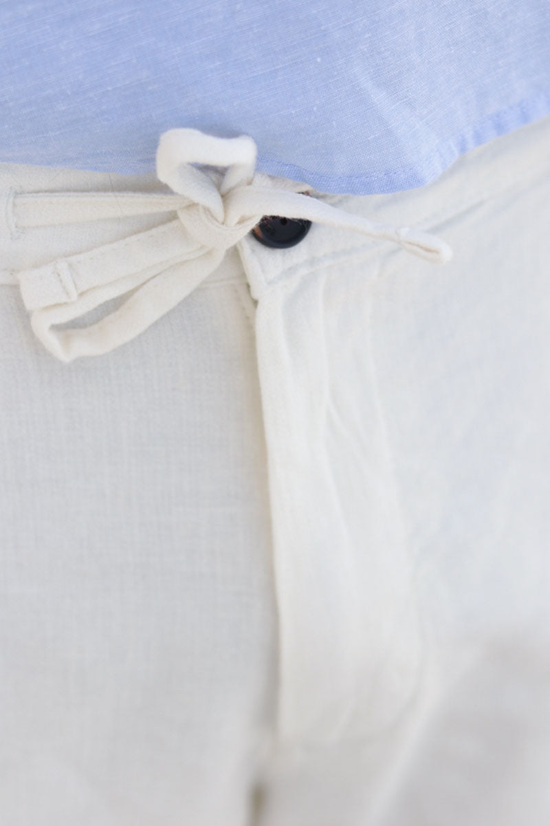 These Brody linen blend shorts offer a comfortable regular fit with a mid-rise waist, featuring a drawstring for an adjustable and secure fit. Made from a breathable mix of organic cotton, linen, and a touch of elastane, they provide both softness and slight stretch for ease of movement. The zip fly fastening adds practicality, and the cotton woven lining ensures a cozy feel against the skin. Their light color, Cloud Dancer, enhances their casual yet refined appearance, making them perfect for springtime wear.