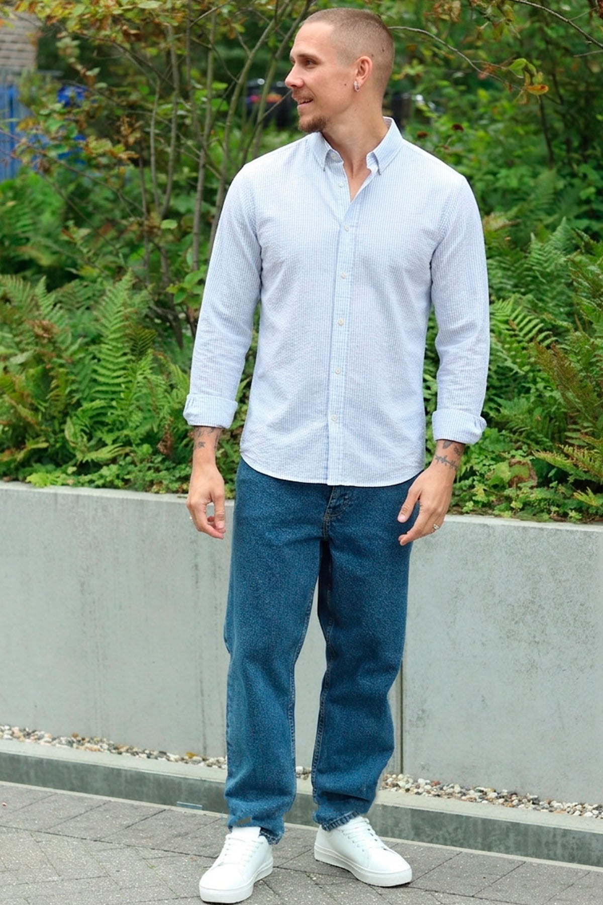 This striped shirt in sky blue offers a comfortable fit and a classic look suited for adult men. Made primarily from cotton with a touch of elastane, it ensures both softness and a slight stretch to maintain shape throughout the day.