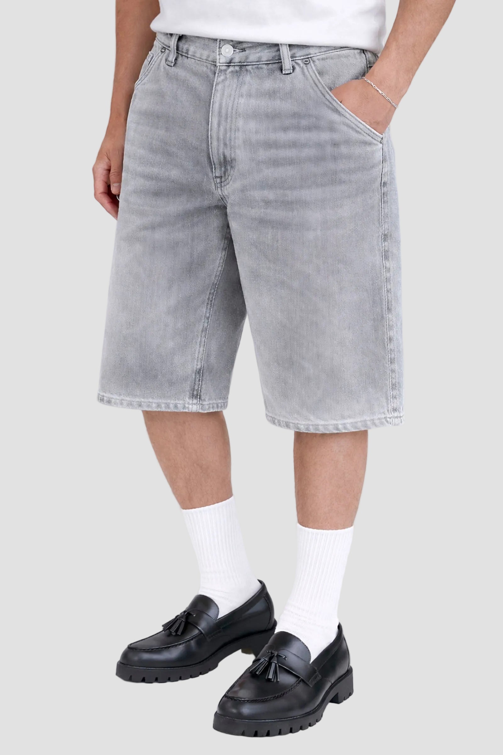 These Talib shorts offer a comfortable and casual fit, crafted from soft cotton that ensures breathability and ease of movement. The grey vintage denim color gives them a stylish and timeless look, perfect for everyday wear.