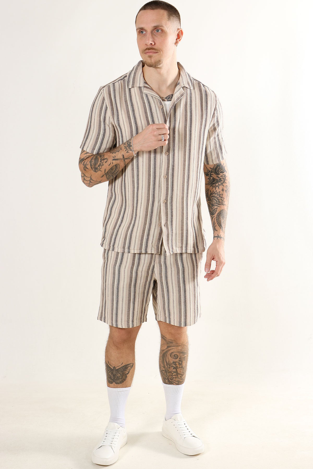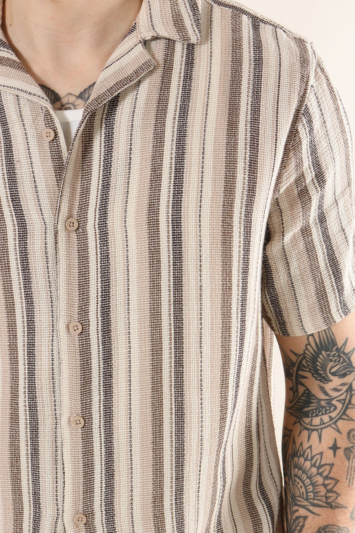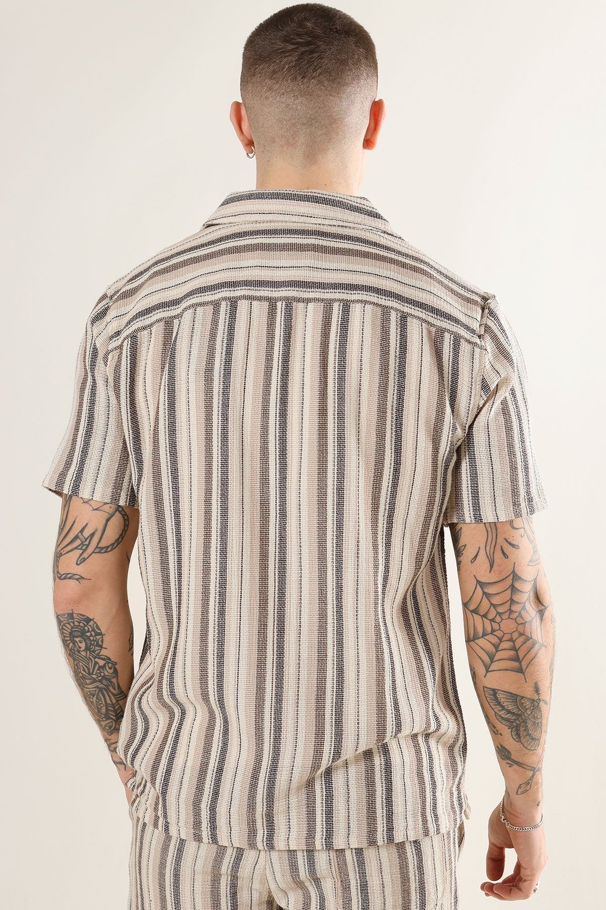 This striped shirt offers a relaxed, regular fit with short sleeves and a resort collar, making it a versatile choice for everyday wear at school or work. Crafted from a blend of recycled polyester, cotton, and recycled cotton, it provides both comfort and sustainability in a soft gardenia tone.