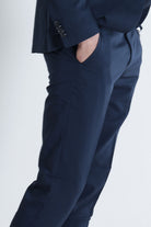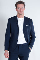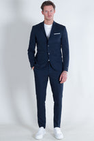 The Comfort Suit in Dark Navy is designed with both comfort and style in mind. The suit is made of a blend of polyester, viscose, and elastane, which provides a comfortable and stretchy fit. The added elastane in the material gives the suit more flexibility and ensures that it moves with your body, providing freedom of movement and comfort. -