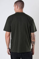 This relaxed fit t-shirt features short sleeves and a round neckline for easy, everyday wear. Made from soft and stretchy jersey fabric, it provides comfort throughout the day while maintaining a timeless look perfect for both casual and festive occasions. The color, Rosin, leans towards a dark green shade, adding a subtle yet versatile touch to your wardrobe.