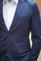 This slim-fit blazer features a reverse neckline and comes in a deep night sky color, perfect for dressing up for celebrations or any formal occasion. The fabric combines 64% viscose, 31% recycled polyester, and 5% elastane, providing a comfortable and slightly stretchy feel that moves with you. Designed with a modern silhouette, it adds a tailored touch to your outfit without compromising on comfort.