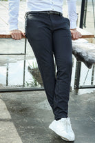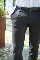 The black color in combination with the stylish white pinstripes makes these pants a sophisticated and modern choice for any occasion. The subtle pattern also allows for pairing the pants with different colors and patterns.