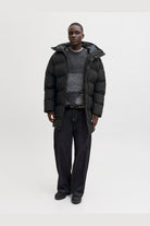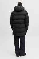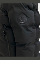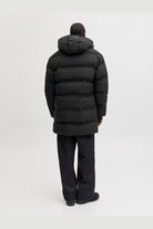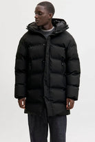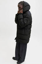 This long puffer jacket features a hood with string regulation and offers reliable warmth thanks to its synthetic fiber down padding. The durable woven fabric combines 50% polyester with 50% recycled polyester, creating a sustainable and sturdy outerwear piece designed for comfort and longevity. It closes securely with button and zip fastenings, while ribbed cuffs provide a snug fit. The jacket also includes side pockets with zip closures and extends to knee length, making it suitable for the colder months.