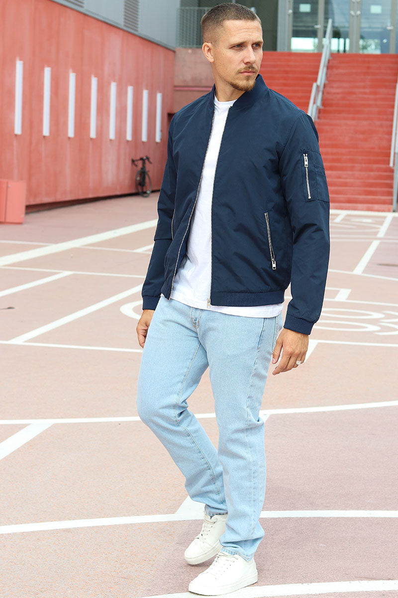 This bomber jacket offers a casual and comfortable option for everyday wear. Crafted from lightweight fabric, it feels thin and breathable while providing water-resistant functionality. The jacket features a baseball collar and long sleeves, combined with a practical zip fastening that runs along the front. It includes front pockets with zip closures and an additional sleeve pocket, making it both stylish and functional. Its short length adds to a sleek, modern silhouette.