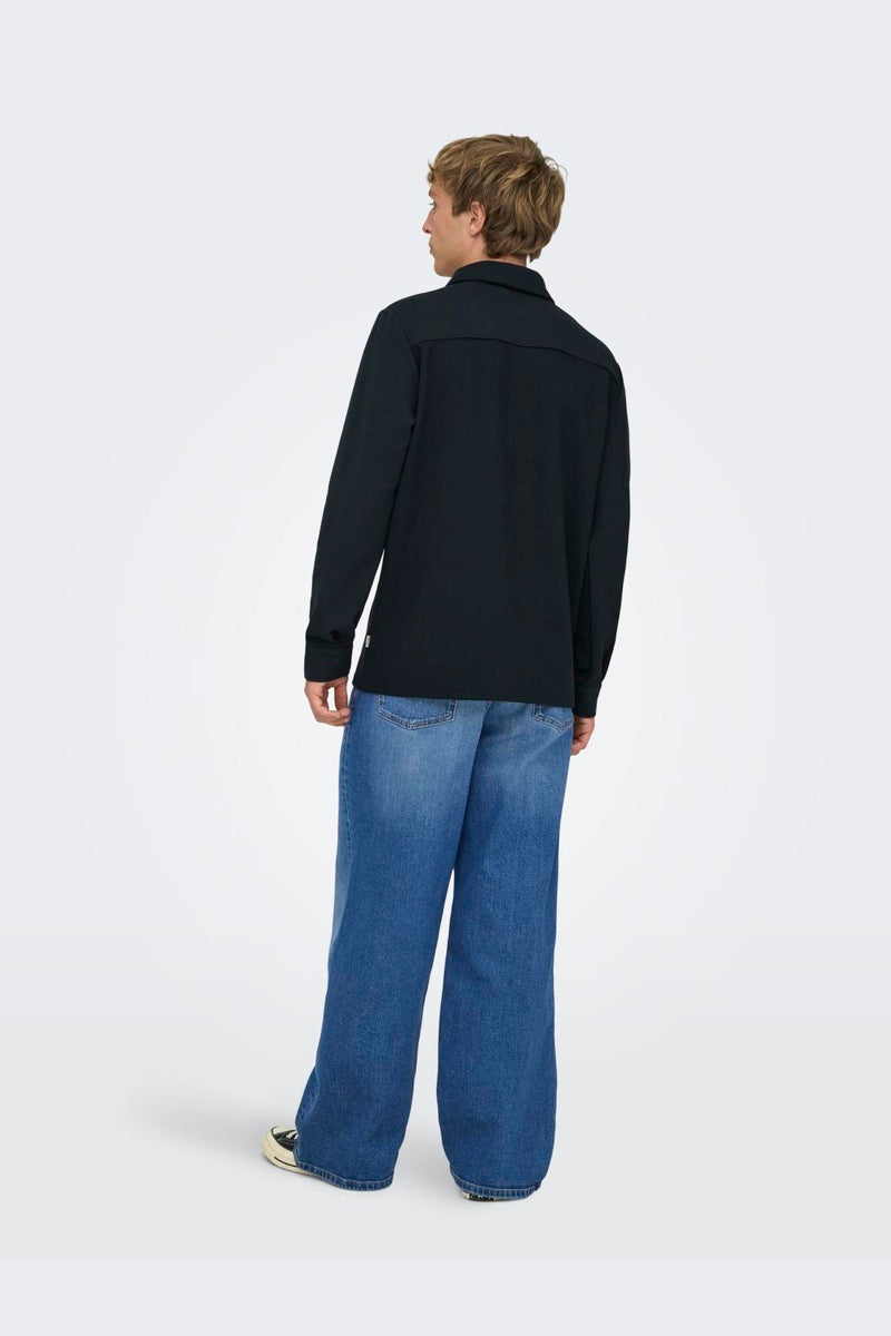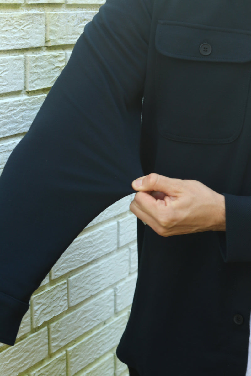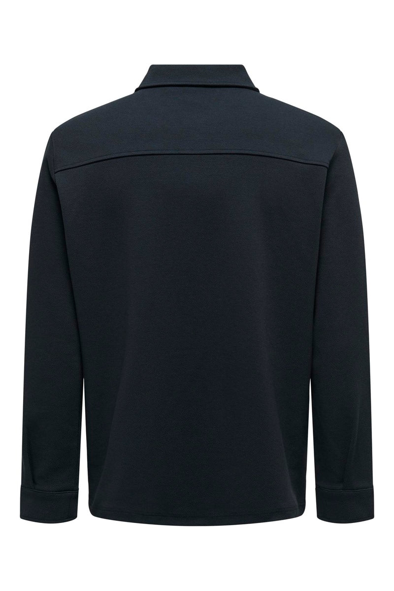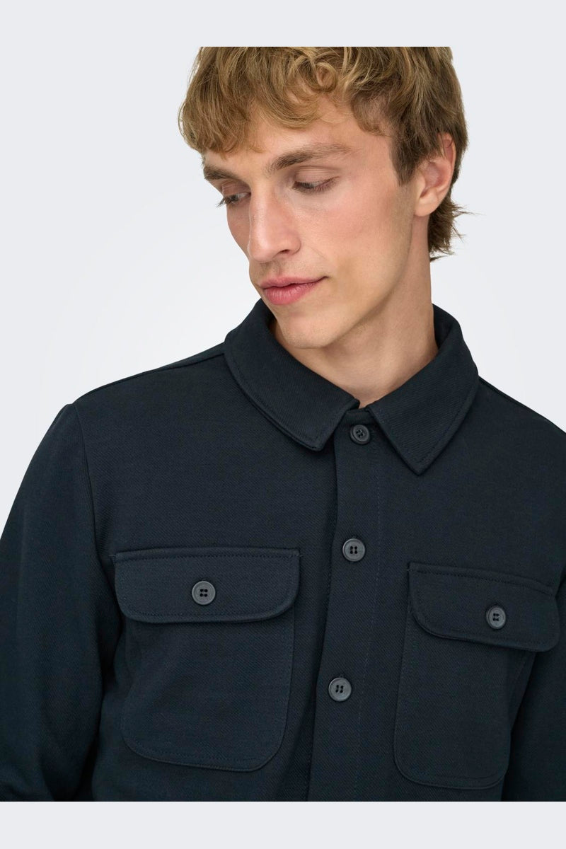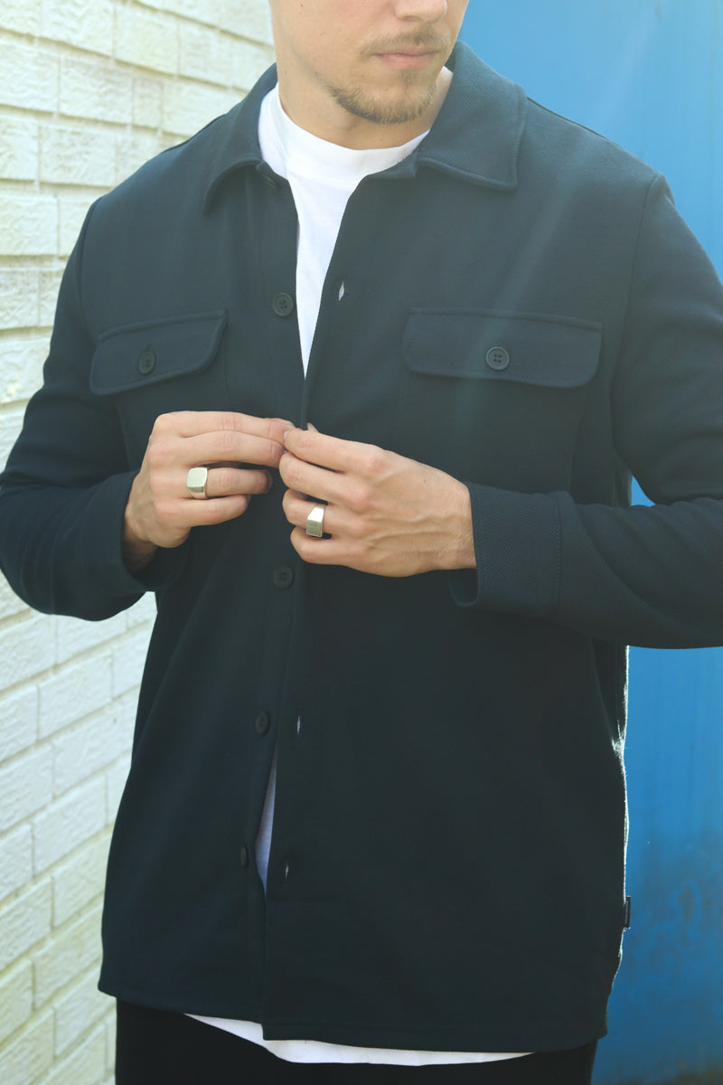 This overshirt features a relaxed regular fit with long sleeves and a classic shirt collar, perfect for layering throughout the cooler seasons. Crafted from a soft blend of recycled polyester, viscose, and elastane, it offers both comfort and stretch. The button fastening at the front and chest pockets with button closures add practical details to this versatile piece. Its dark navy shade makes it a timeless choice that pairs well with jeans or tailored pants for everyday, work, or special occasions.