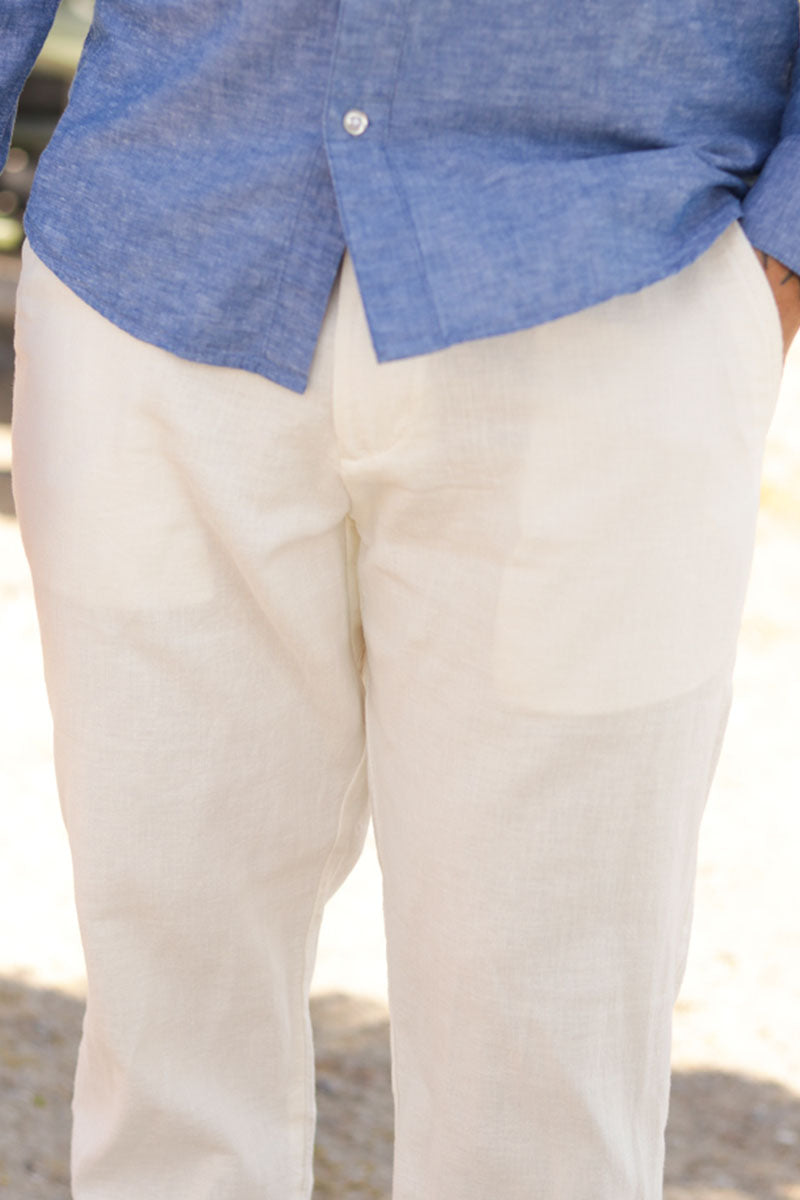 These slim tapered trousers offer a comfortable and stylish fit ideal for a relaxed, off-duty wardrobe. Crafted from a blend of organic cotton and linen with a hint of elastane, they combine natural breathability with gentle stretch. The mid-rise waist and button and zip fly fastening make for easy wear and a clean silhouette. Their soft cloud dancer color adds a subtle touch of elegance to casual outfits.