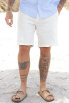 These Brody linen blend shorts offer a comfortable regular fit with a mid-rise waist, featuring a drawstring for an adjustable and secure fit. Made from a breathable mix of organic cotton, linen, and a touch of elastane, they provide both softness and slight stretch for ease of movement. The zip fly fastening adds practicality, and the cotton woven lining ensures a cozy feel against the skin. Their light color, Cloud Dancer, enhances their casual yet refined appearance, making them perfect for springtime wear.