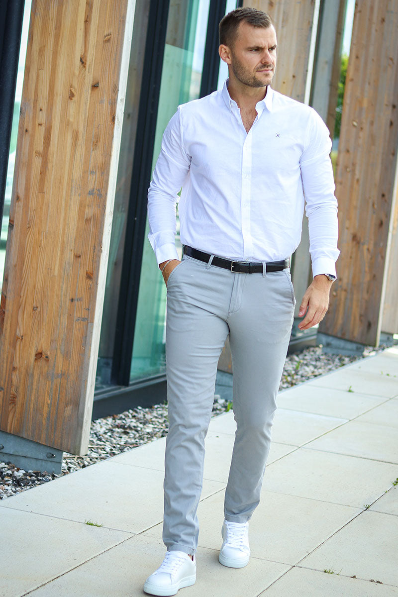 Elevate your closet with a pair of chinos made from a strong and durable woven fabric that offers a smart-casual alternative to jeans. These slim fit, low-rise trousers feature a zip fly fastening and include both front and back pockets, combining style and functionality.