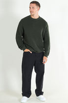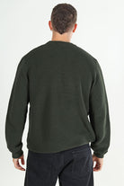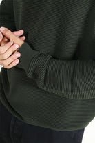 • The knit sweater has ribbed edges at the hem, sleeves, and collar.