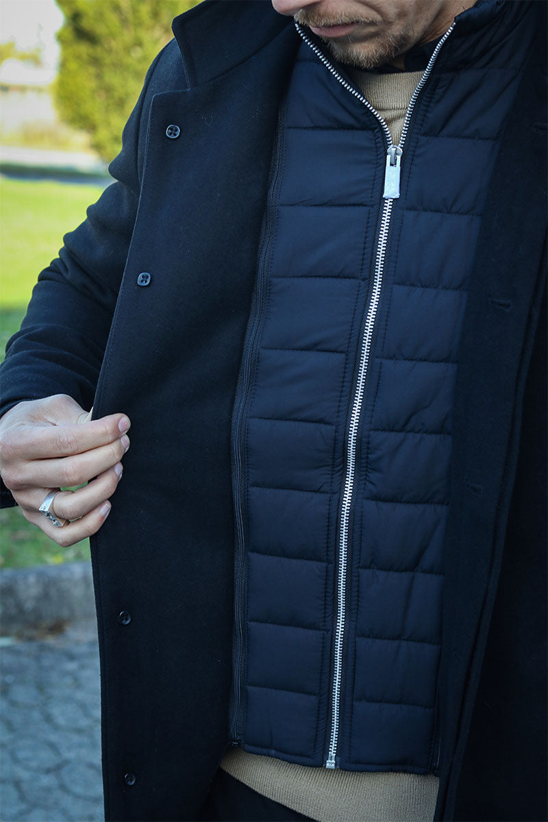 - Black wool jacket with vertical side pockets.