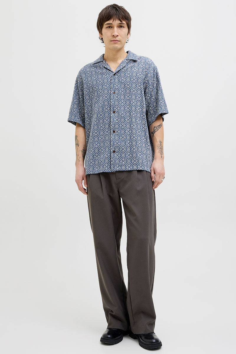 - Short-sleeved shirt with small geometric patterns.