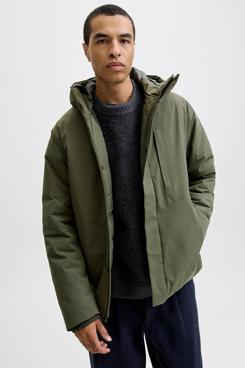 - Solid-colored parka jacket with hood