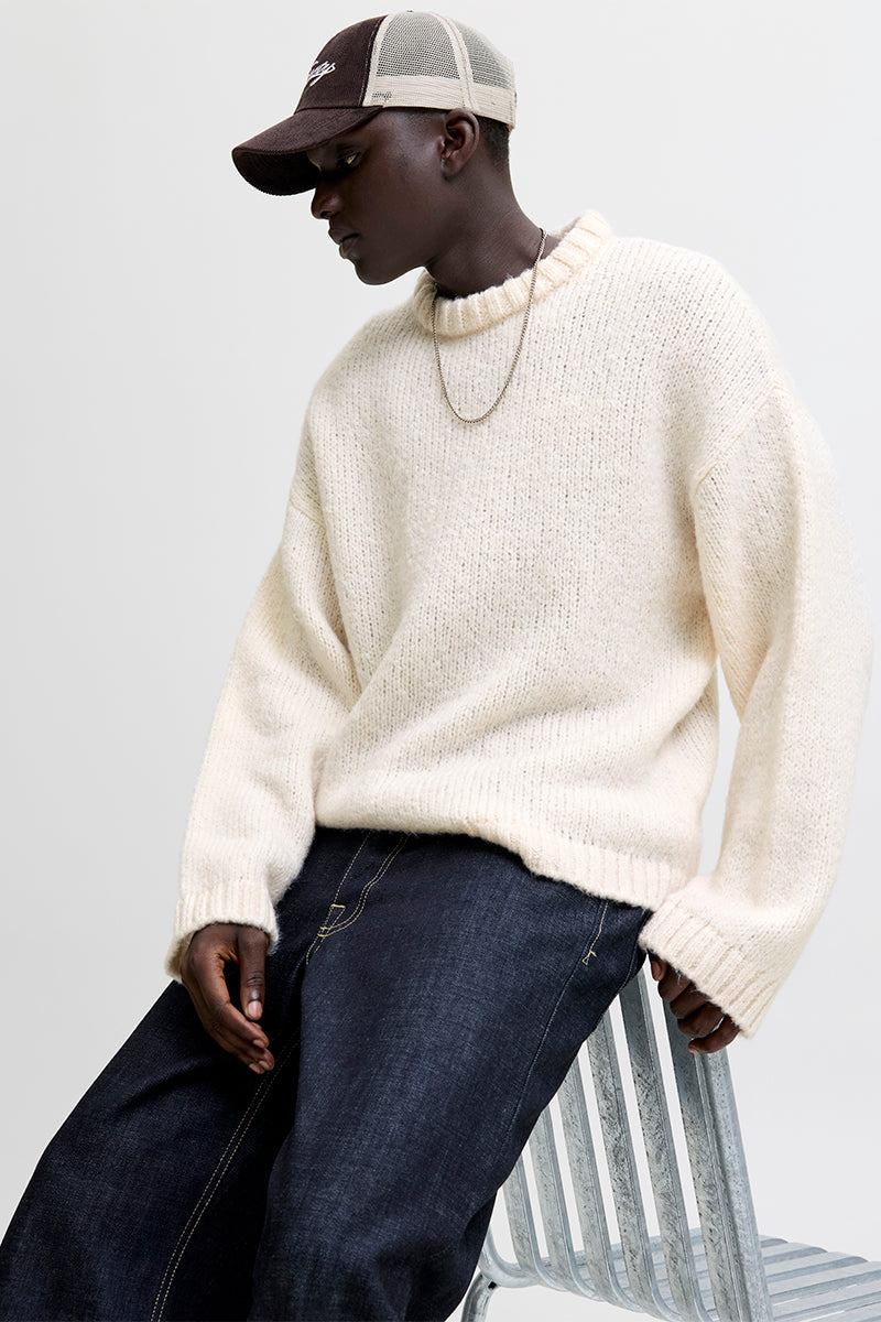 - The sweater has a crewneck, long sleeves, and a chunky texture. Additionally, it features ribbed cuffs and hem.