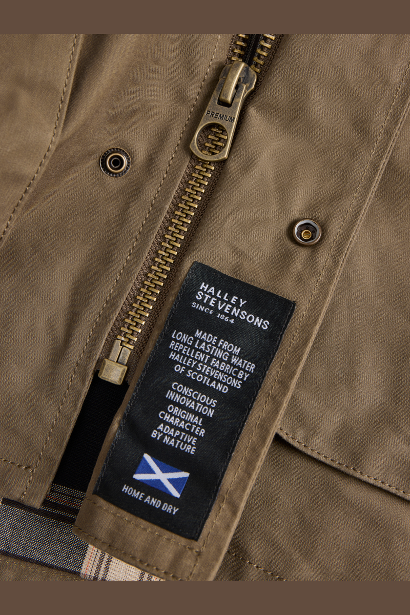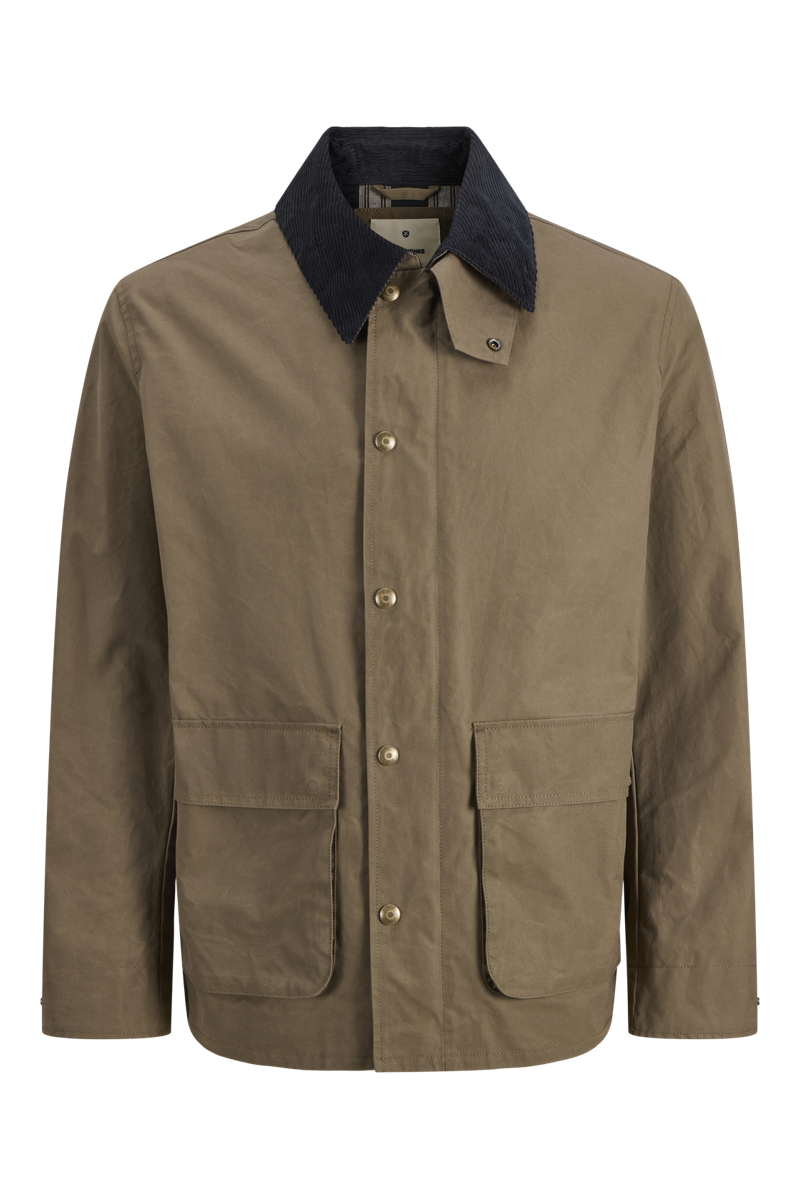 This waxed jacket features a classic spread collar and long sleeves, offering a timeless look suitable for winter wear. Crafted entirely from cotton, it provides a comfortable and durable option for everyday outerwear. The muted canteen color adds a subtle, versatile touch that pairs well with various styles.