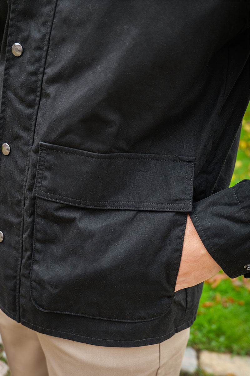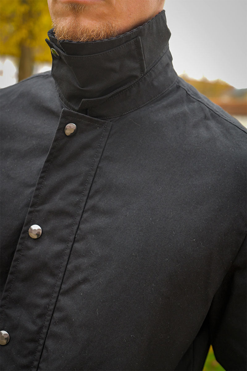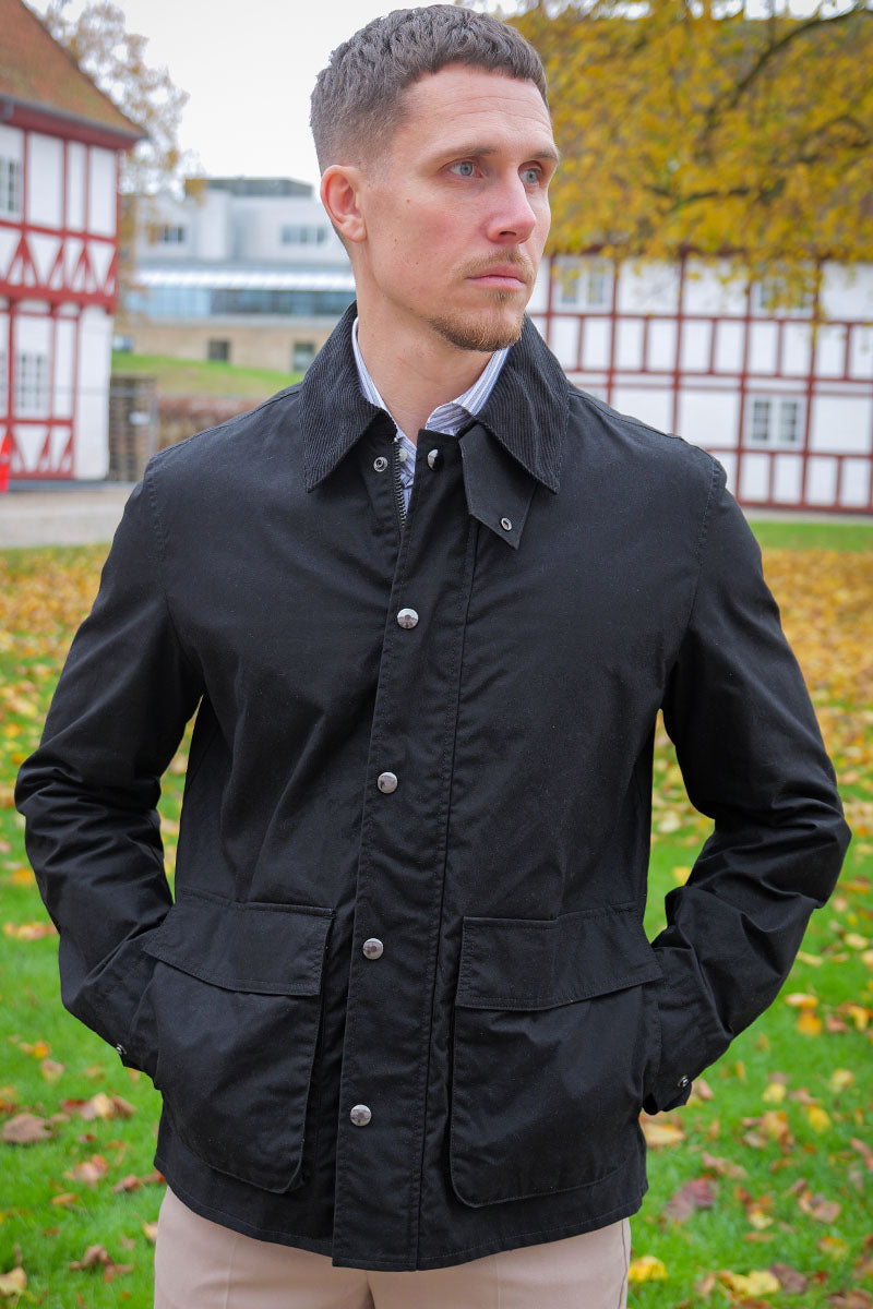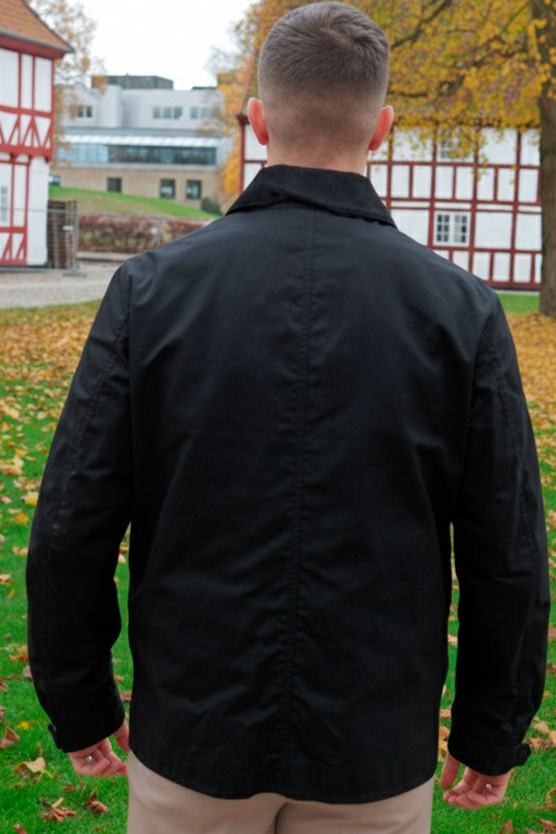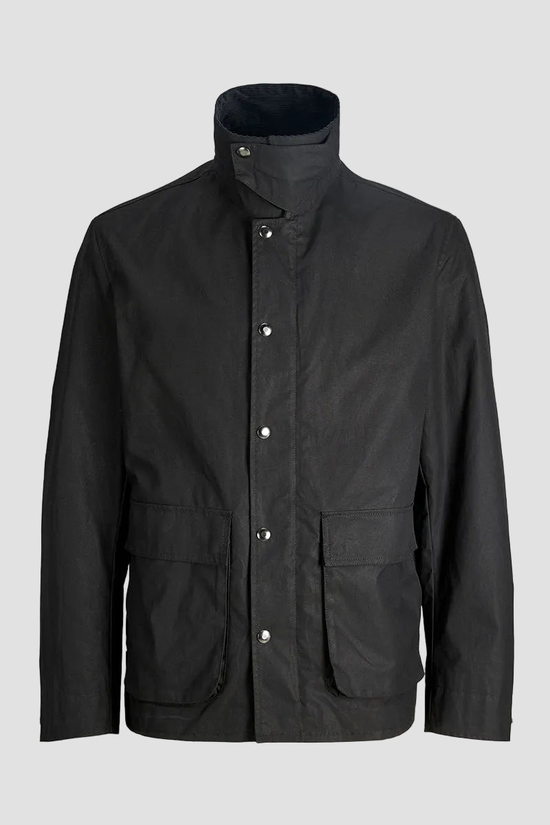 This Waxed Jacket is a durable outerwear piece designed for everyday use, featuring a classic cut and long sleeves. Made from 100% cotton, it offers a robust and long-lasting quality without stretch—perfect for outdoor activities. The jacket includes a spread collar and a closure with both buttons and a zipper, as well as practical front pockets. The deep black colour makes it easy to pair with many styles and occasions.